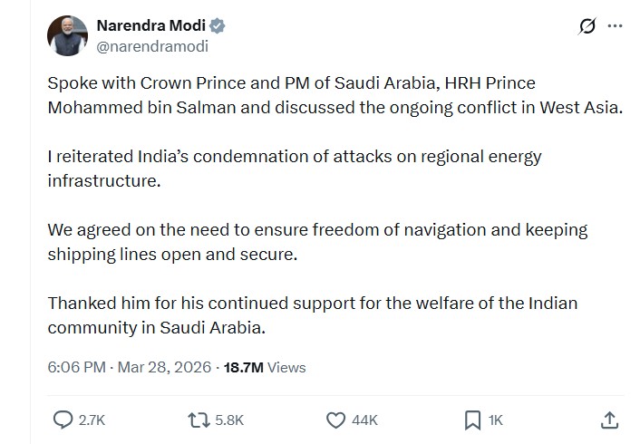 The Prime Minister, Shri Narendra Modi, today spoke with Crown Prince and PM of Saudi Arabia, HRH Prince Mohammed bin Salman and discussed the ongoing conflict in West Asia. Shri Modi reiterated India’s condemnation of attacks on regional energy infrastructure, and the need to ensure freedom of navigation and keeping shipping lines open and secure. “Thanked him for his continued support for the welfare of the Indian community in Saudi Arabia”, Shri Modi stated.